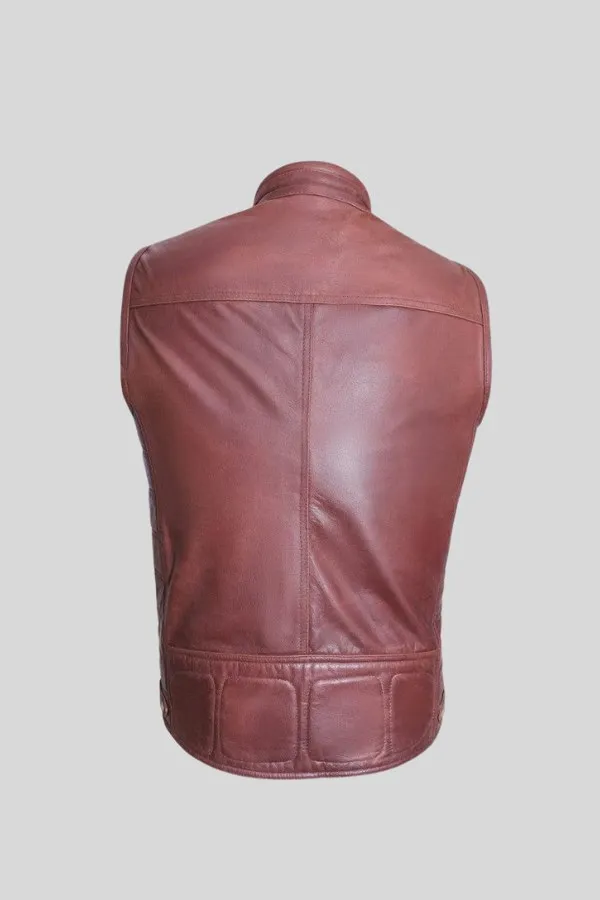 Upgrade your wardrobe with the Men’s Brown Leather Vest from Zyra – blending style, comfort, and utility. Handmade from pure sheep leather, this vest features four front pockets and unique red stitching, offering a sleek, lightweight, and comfortable fit perfect for casual or motorcycle-inspired looks.