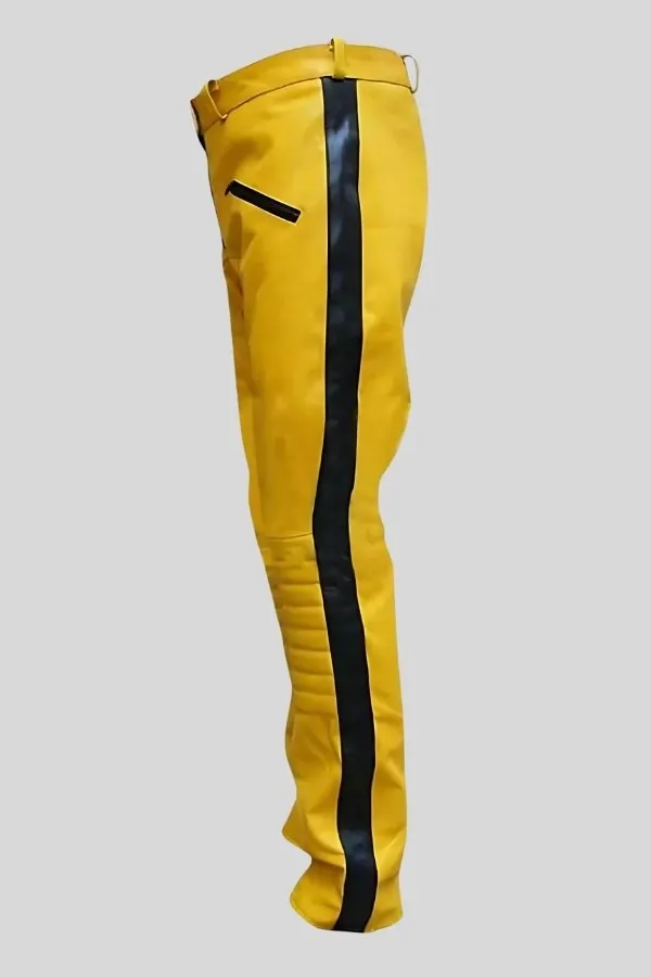 Men’s Yellow Leather Pants with Black Stripe Design – Bold Stylish Look